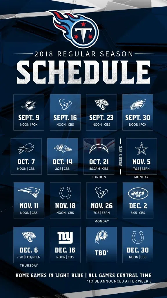 For the first time since 2007, the Tennessee Titans have three primetime games – including two Monday Night Football games (Nov. 5 at Dallas & Nov. 16 at Houston) and a matchup vs. the Los Angeles Chargers in London for Week 7.