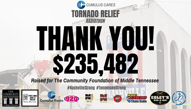 Cumulus Nashville thanks our generous listeners and client partners for well-surpassing our original goal and helping us give back to the community in the wake of the devastating tornados in Middle Tennessee. All funds were donated to the Middle Tennessee Emergency Response Fund activated by the Community Foundation of Middle Tennessee to support those affected in Davidson and surrounding counties.