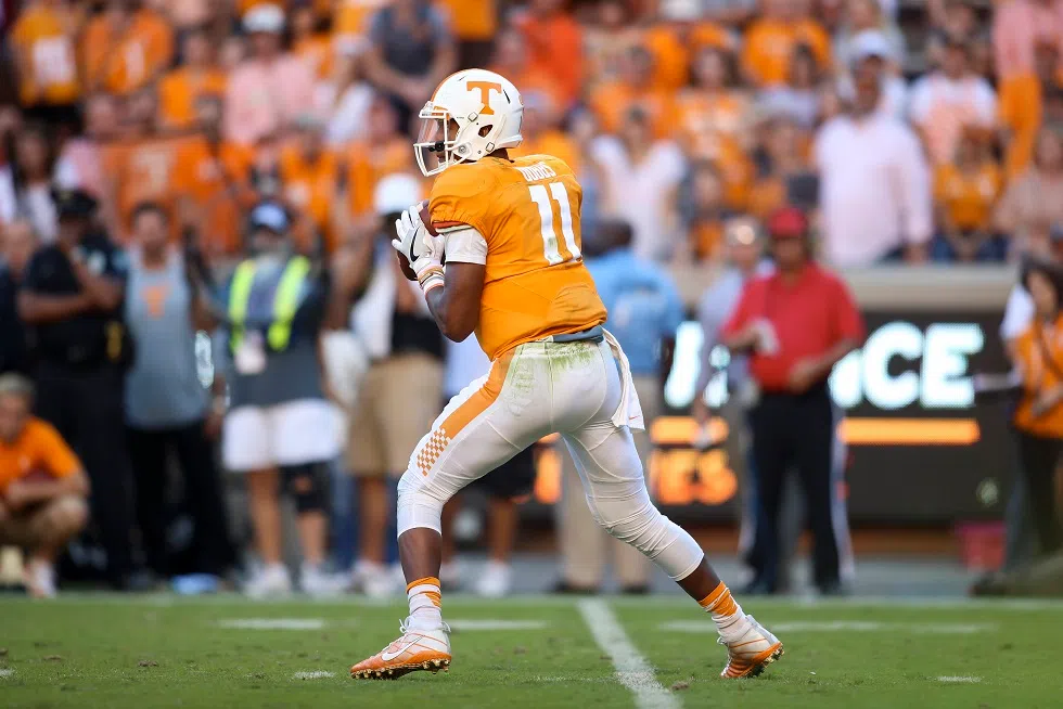 KNOXVILLE, TN – OCTOBER 15, 2016 – quarterback Josh Dobbs #11 of the Tennessee Volunteers during the game between the Alabama Crimson Tide and the Tennessee Volunteers at Neyland Stadium i...