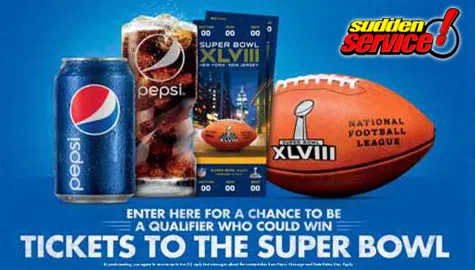 Sudden Service Convenience Stores and Pepsi want to Send YOU to Super Sunday! Stop in to any Sudden Service Convenience Store and look for the Pepsi Super Bowl display. Text the code on the display fo...
